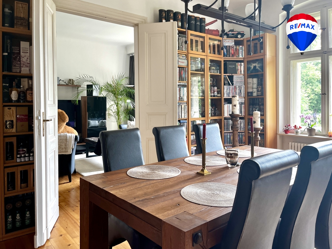 Die elegante Gründerzeitvilla „Bellevue“ wurde 1905 erbaut und im Jahr 2003/2004 aufwendig und denkmalgerecht saniert. Mit viel Liebe zum Detail wurden historische Elemente bewahrt und moderne Ausstattungen integriert. Das Anwesen umfasst ein parkähnliches Grundstück von 2.660 m² mit sechs Wohneinheiten im Haupthaus, sowie einem ausgebauten Rückgebäude (Remise). Eine gemeinschaftlich nutzbare Saunaanlage und ein Fahrradraum im Keller stehen allen Bewohnern zur Verfügung.Zum Verkauf steht die 99 m² große Wohnung im 1. Obergeschoss. Sie besticht durch hohe Decken (2,85 m), eine durchdachte Raumaufteilung mit drei Zimmern, einer großzügigen Wohnküche, sowie einem stilvoll ausgestatteten Bad. Zwei Balkone bieten Sonne zu jeder Tageszeit. Originale Landhausdielen, Glasmosaikfliesen in Bad und WC, ein eigenes Kellerabteil (ca. 10 m²), sowie ein optionaler Carport-Stellplatz (13.000 €) runden das Angebot ab.