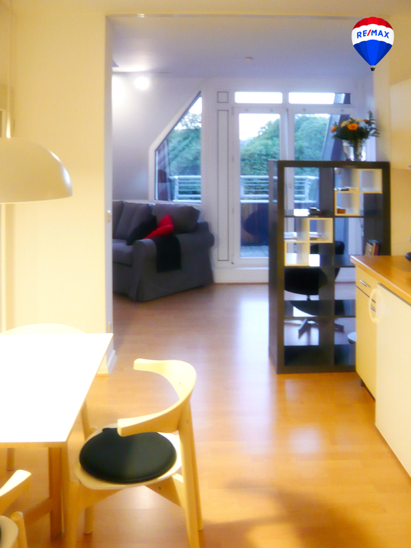 Dachterrasse: Über das Wohnzimmer zugänglich und bietet einen ansprechenden Ausblick – ideal, um an schönen Tagen zu entspannen.