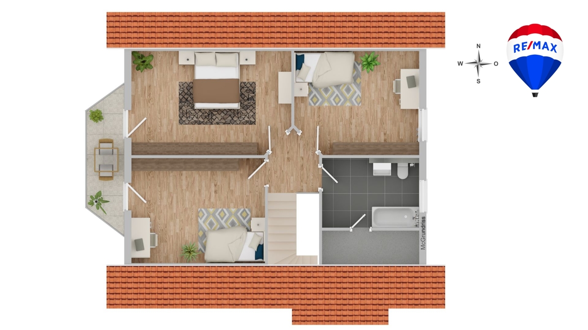 • Balkon an zwei Schlafzimmern (mit Markise)